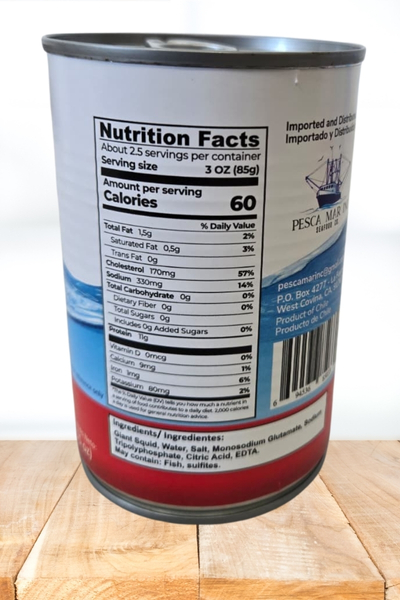 Giant Calamary Squid, Water, Salt, Monosodium Glutamate, Sodium Tripolyphosphate, Citric Acid, EDTA, Sodium Metabisulfite (as preservative).